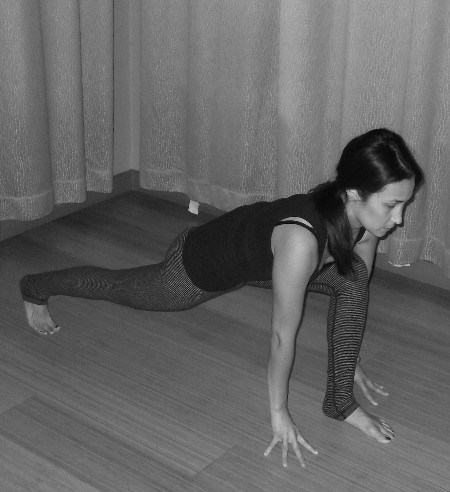 Directions: Start on hands and knees in Table Top pose. Step your right foot up next to your right hand. Make sure the whole sole of the foot is grounded and your knee is directly over your ankle or behind it. If it isn’t, and the knee is leaning forward in front of the ankle, then wiggle or step your foot up even more until it is in line. Curl your back toes under and lift your back knee up. Feet are in line with your hips. Hands are on either side of your front foot or to the inside of it.